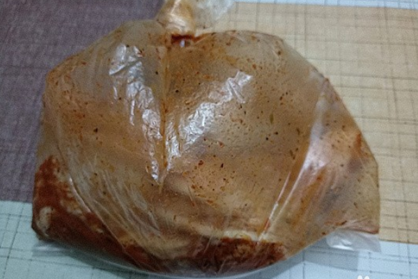 3、用一个保鲜袋装鸡腿,调料汁也一起倒入,然后绑好放冰箱冷藏过夜,中间要翻动几次,这样鸡腿才能腌制充分。