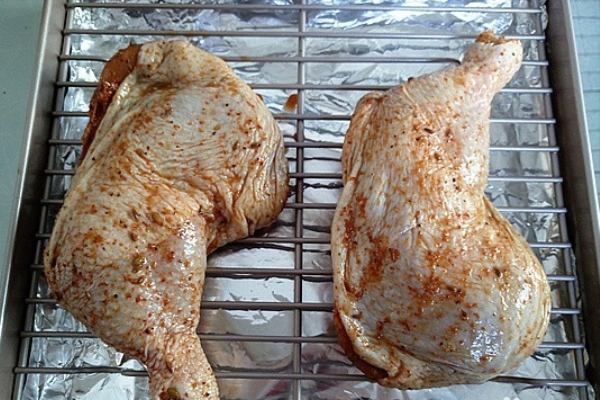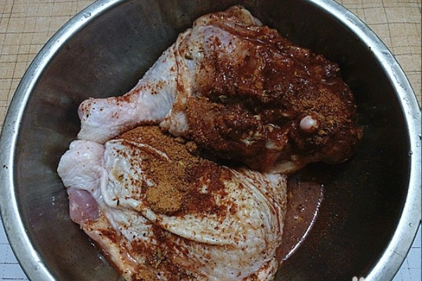 2、泡好的鸡腿稍微晾下水,加入2汤匙料酒,1汤匙生抽,按配方说明倒入烤料,戴上手套抓揉,让调料和鸡腿充分揉匀。调料中有盐份,生抽不要放多了,会咸,可以不放。没有现成的烤料可以自己配,五香粉、辣椒粉、胡椒粉等,随自己喜好。