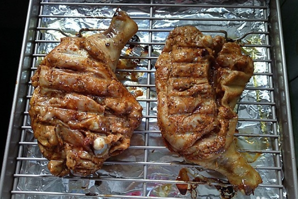 4、准备烤鸡腿的时候,烤盘铺上锡纸,放上烤架,将鸡腿放上,上下火200度35-40分钟,具体时间和温度根据自己的烤箱调节。有皮的那面朝上,先烤15-20分钟。