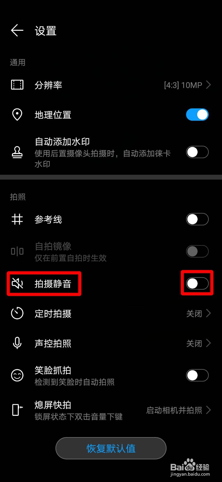 4/5【拍摄静音】选项右边的滑块变成灰色即为关闭状态,蓝色即为开启状态,开启之后,我们手机在拍摄的时候就会默认静音了