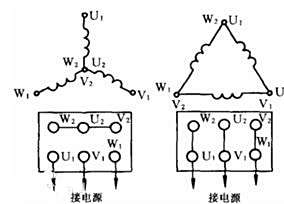 三角形接线将W2和U1、U2和V1、V2和W1三组接线柱分别连接,出线U1、V1、W1分别和外部接线A、B、C三相连接。