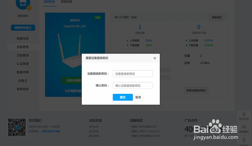 小博无线的路由器RippleOS系统广泛运用于商业场所,本地服务商在实际部署过程中,处于安全性考虑,不同设备登录密码设置不一样,导致经常会忘记密码,或者被商家复位设备后更改了密码,导致服务商无法登录。遇到这些问题就需要对设备进行密码恢复。RippleOS路由器是无初始密码,初始密码是在第一次设备配置过程中由服务商设置的。工具/原料more可以登录小博无线运营平台能够操作RippleOS路由器远程重置路由器密码1/5分步阅读