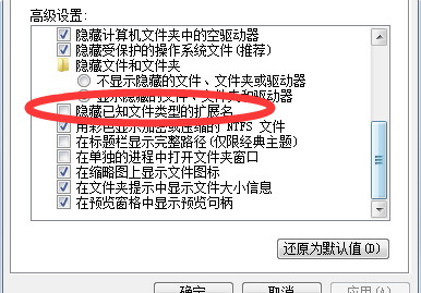 4、进入“查看”栏目,取消勾选的“隐藏已知文件类型的扩展名”,点击确定。