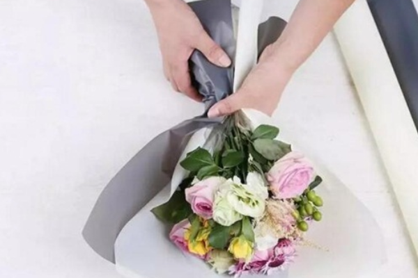 也可进行不规则包花,选择一个白色的长方形包装纸,其大小应比花束稍大一些。然后将长度剪切在10cm的鲜花捆好,摆放在纸上,从根茎处将包装纸捏紧在一起,在外面覆盖一层灰色包装纸,同样捏紧使其有不规则之美。之后再用细绳将其从捏紧处捆绑,就完成包花了。