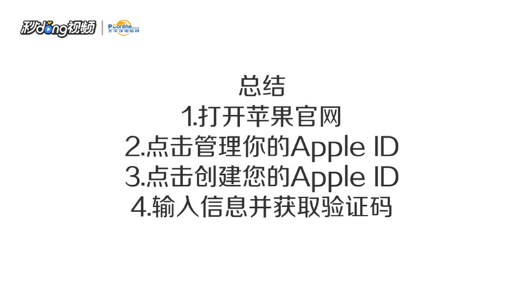 4/4总结:打开苹果官网,点击管理你的apple ID,点击创建您的apple ID,输入信息并获取验证码。