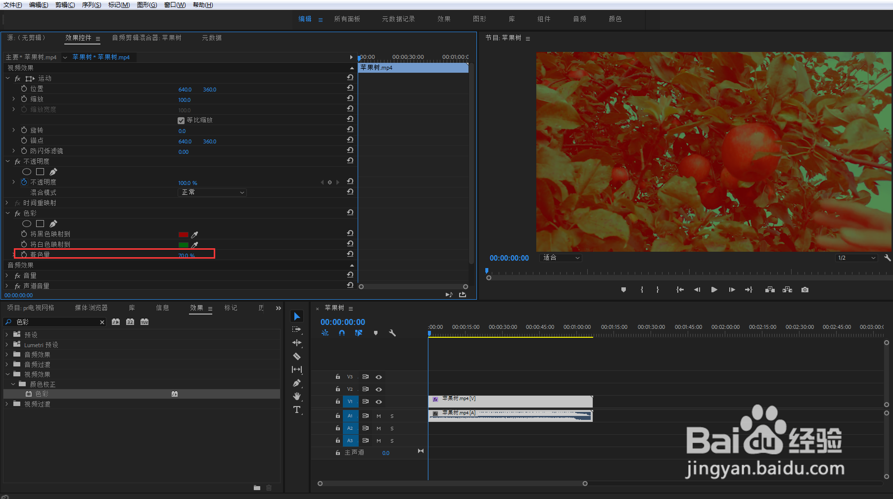 2/62.在效果中搜索色彩,并把这个效果拖到V1视频上;如图
