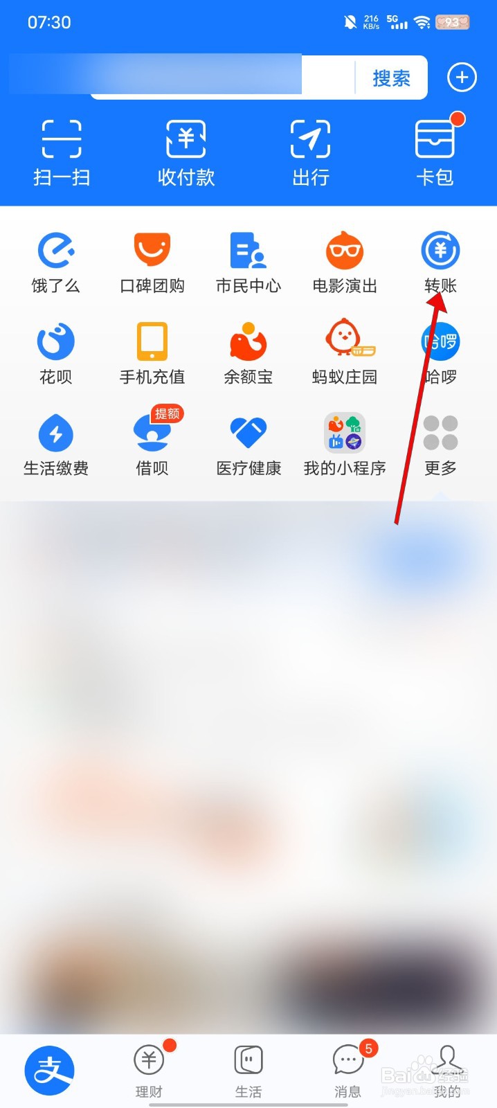 首先打开支付宝软件APP,进入首页后,点击上方‘转账’进入