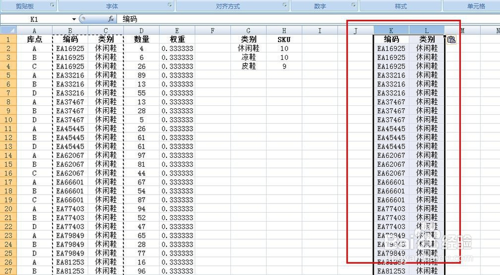 这里随机生成一个库存表做演示,同一编码的鞋有几个库点,同一类别有多个编码,我们的目的就是统计每个类别有几个编码,即SKU数