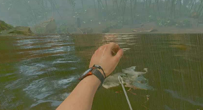 手里先拿着鱼竿,打开背包把鱼钩放上去,然后鱼钩上放蛆或者幼虫,操作鱼竿把鱼钩丢出去就可以钓鱼了。这个游戏中鱼钩落水是没有动画效果的。