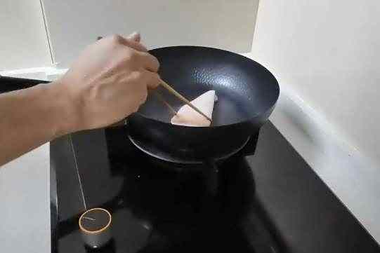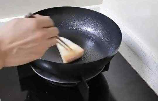 3、用猪油块摩擦加热的锅,将锅内部的锅面都要均匀反复摩擦。