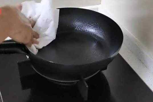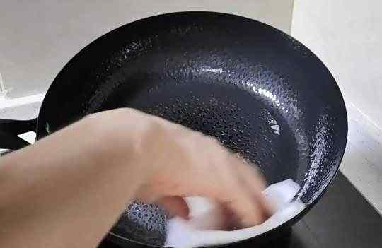 11、用抹布将花生油均匀地擦拭于锅内侧。