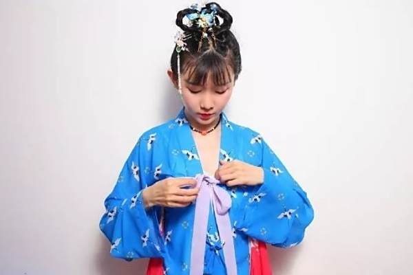 9、蝴蝶结系成后,即可完成齐胸襦裙的穿着。