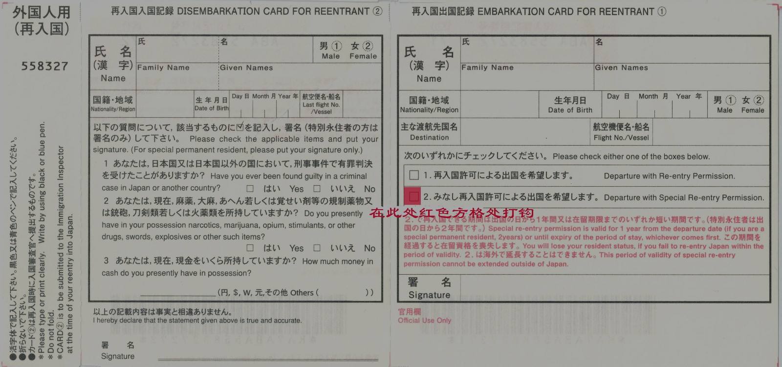 2014年7月1日起,再入境用申报卡增加了“希望利用再入国许可出境”和“希望利用视同再入国许可出境”两个选择项。当事人必须选择一项,且只可按照所选项再入境。请注意: