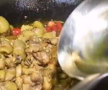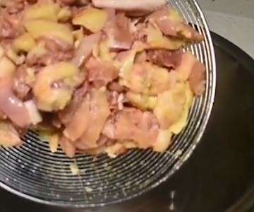 3、锅中油热后倒入三黄鸡,炸熟捞出。