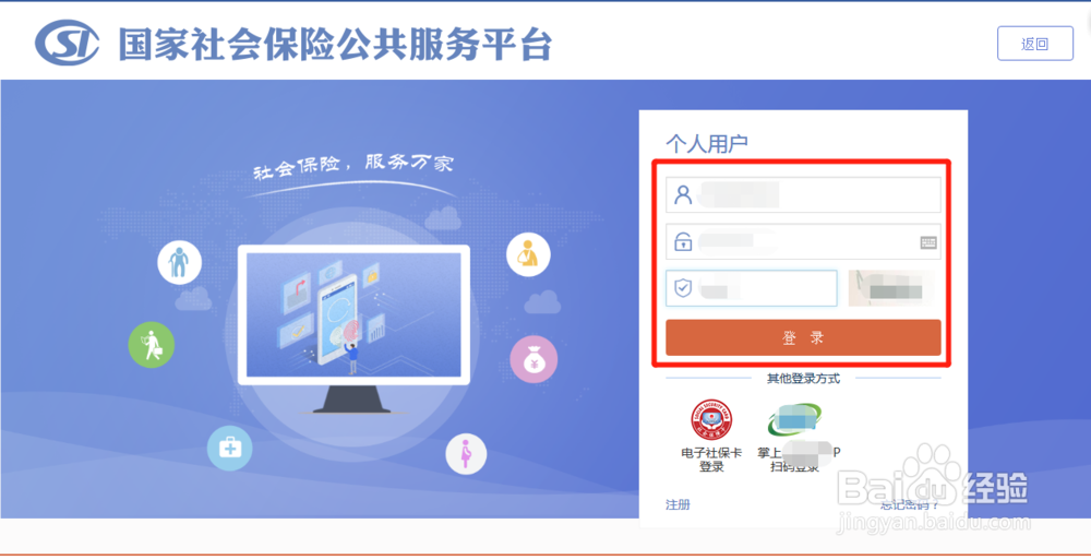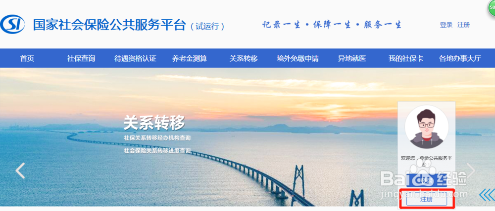 1.使用电脑浏览器打开“国家社会保险公共服务平台”网页,点击“注册”。