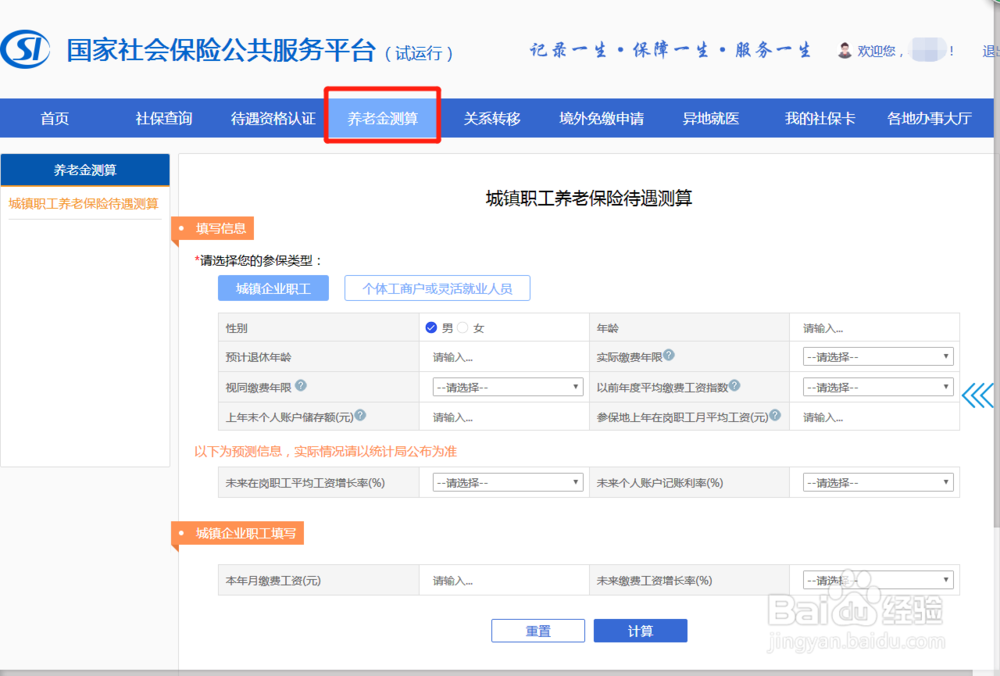 7/77.同时,您还可以输入您目前的社保信息进行“养老金测算”。