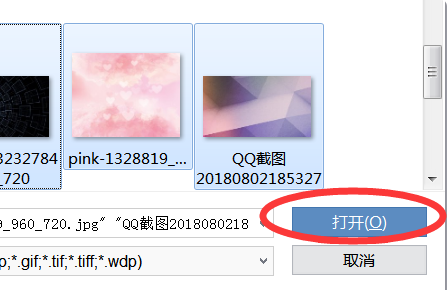 1、首先在Word中插入三张图片,在插入图片对话框中点击“打开”。