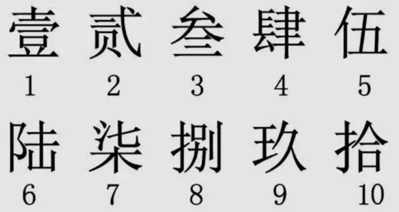 不管是阿拉伯数字(1、2、3……)还是汉字小写数码(一、二、三……),都由于笔画简单,容易被涂改伪篡。所以,一般文书和商业财务票据上的数字都要采用汉字大写数码:壹、贰、叁、肆、伍、陆、柒、捌、玖、拾、佰、仟(“万、亿、兆”本身笔画已经比较复杂,使用机会也少,没有必要再用别的字代替)。如:“3564元”写作“叁仟伍佰陆拾肆圆”。