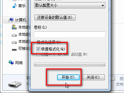 7、勾选“快速格式化”,点击“开始”完成格式化。就可以将文件复制回来,去汽车上测试了。
