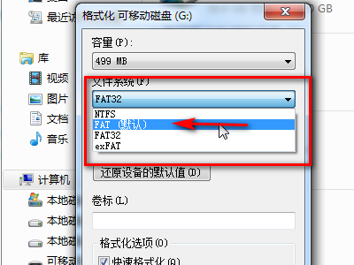 5、点击“文件系统”下拉菜单,点选“FAT(默认)”。