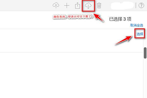 5、确定好自己要下载的照片后,点击照片右侧的“选择”进行确认,当有照片被选中后,“下载所选项目”图标即刻变为深色,表示可以下载了。