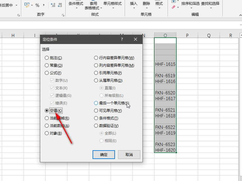 4、在弹出的定位条件窗口中我们选择空值,然后点击确定。