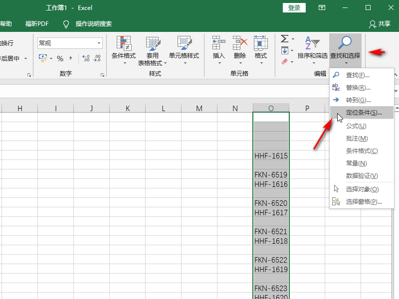 3、然后选中我们想要删除空行的数据区域,然后在开始菜单中找到查找和选择选项菜单,点击,在下拉列表中选择定位条件。