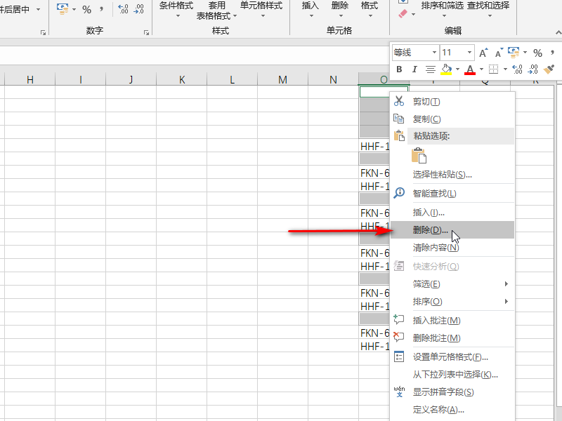 5、确定完成之后可以看到所有的空白行已经被选择,然后我们按照键盘上的CTRL键,在第1个选中的空白单元格上右键选择删除。