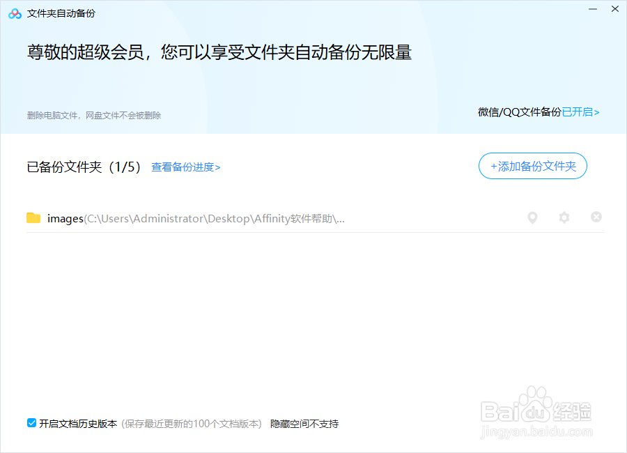 5/5在这里,我们可以看到备份的进度,还可以添加另外的备份文件夹,如图所示。当然,如果你要取消自动备份文件功能,可以单击备份文件目录右侧的❌按钮