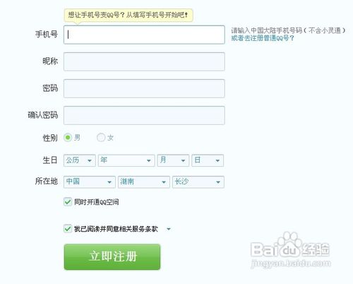 首先先从新申请的QQ开始演示、新申请的QQ在申请QQ的页面我们选择手机帐号注册。然后我们填写自己的手机号码!!填写相关信息之后注册!!