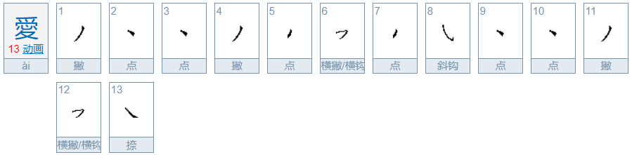 爱的大写笔顺为:撇、点、点、撇、点、横撇/横钩、点、斜钩、点、点、撇、横撇/横钩、捺。