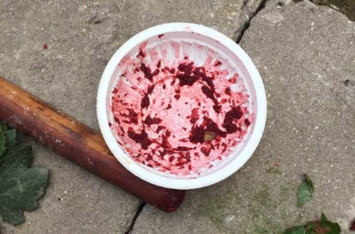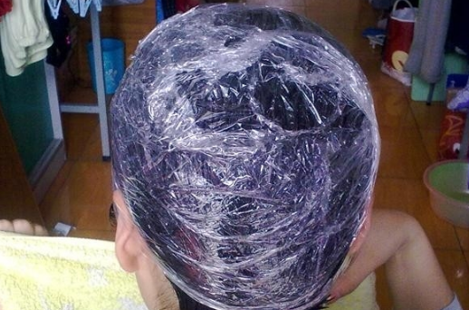 2、捣碎完成的时候,就可以用一次性手套将碎末的指甲草酱涂在白色的头发上,用保鲜膜包住。