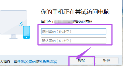5.然后在电脑中会弹出一个小窗口,两次输入同一个 访问密码 ,然后点击确定,然后在手机也会弹出一个页面,输入刚才的密码,然后点击 确定 按钮。