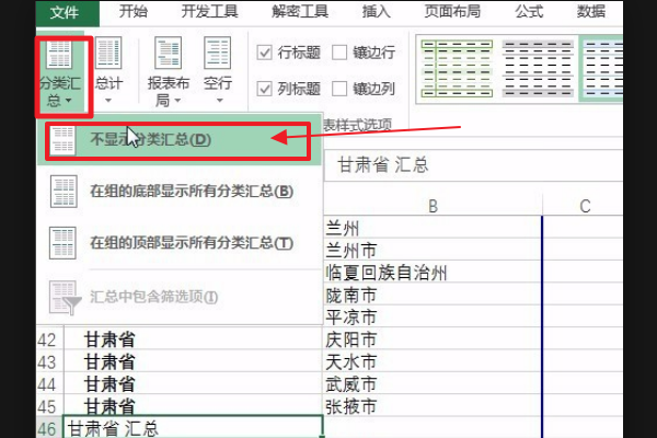 4、在设计页面的选项上找到分类汇总选项,点击在下拉对话框中点击“不显示分类汇总”,进入下一页面。
