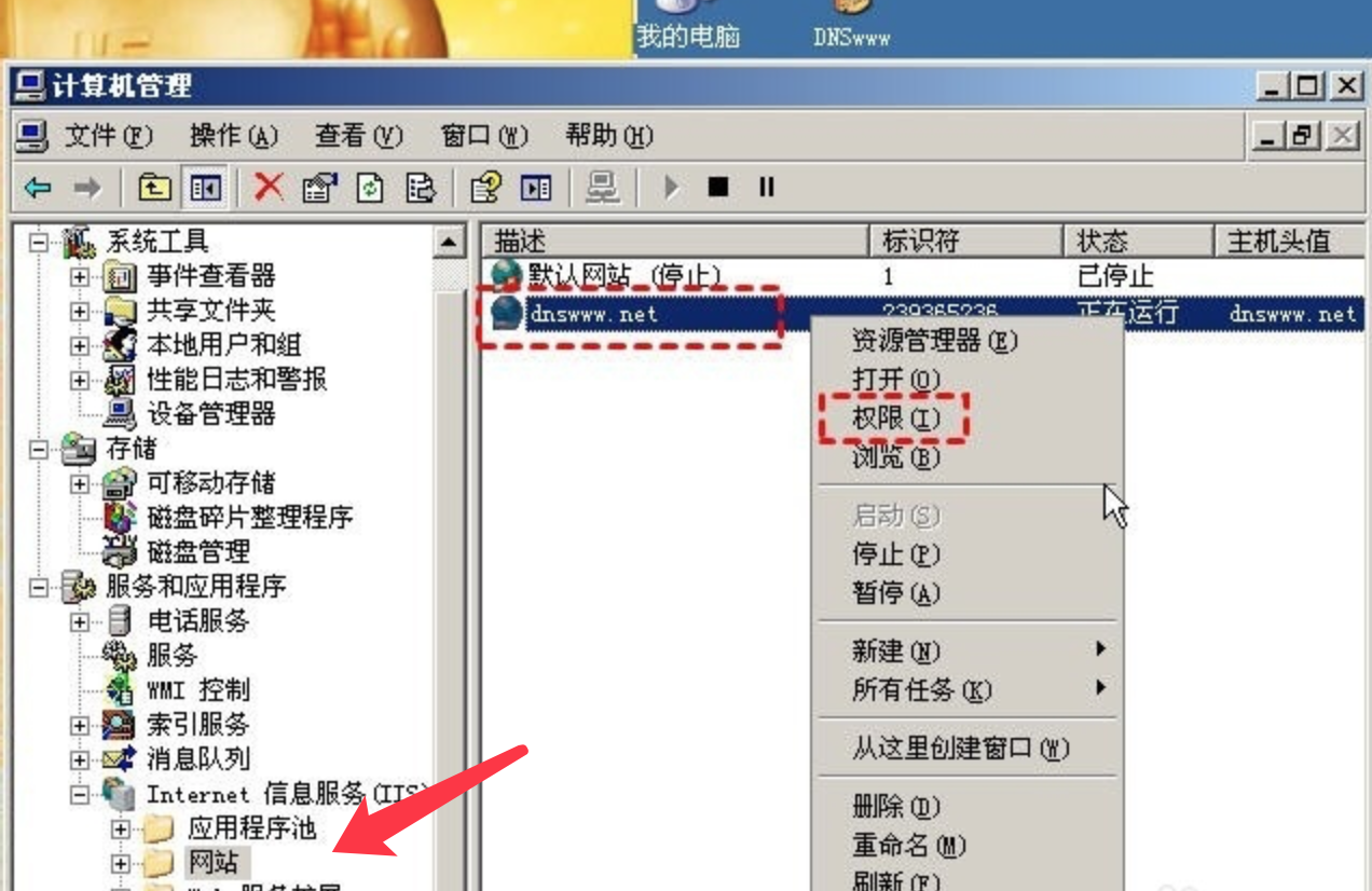 2、打开计算机管理后,找到internet服务,点击网站,在右侧右键点击net主站,下拉菜单选择权限,点击打开。