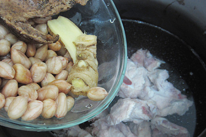 7、锅内注入适量的清水,把龙骨、花生、陈皮、姜片一同放进锅里,盖上锅盖。