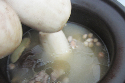 9、汤水煲至一小时后,放进莲藕一同煲,煲至食材软烂。
