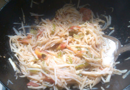 5.土豆削皮,切丝泡水;青椒切丝;西红柿切小块,入锅内炒熟。
