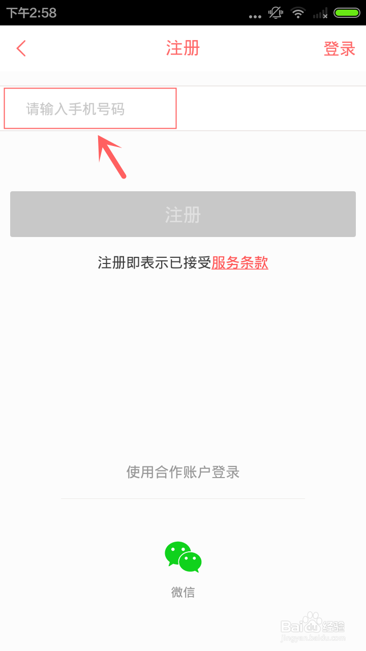 4/6觉得服务条款能接受,就可以在框里填上自己的手机号码,再点击“注册”