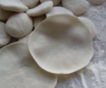 6、面团分成小份,擀成饺子皮。