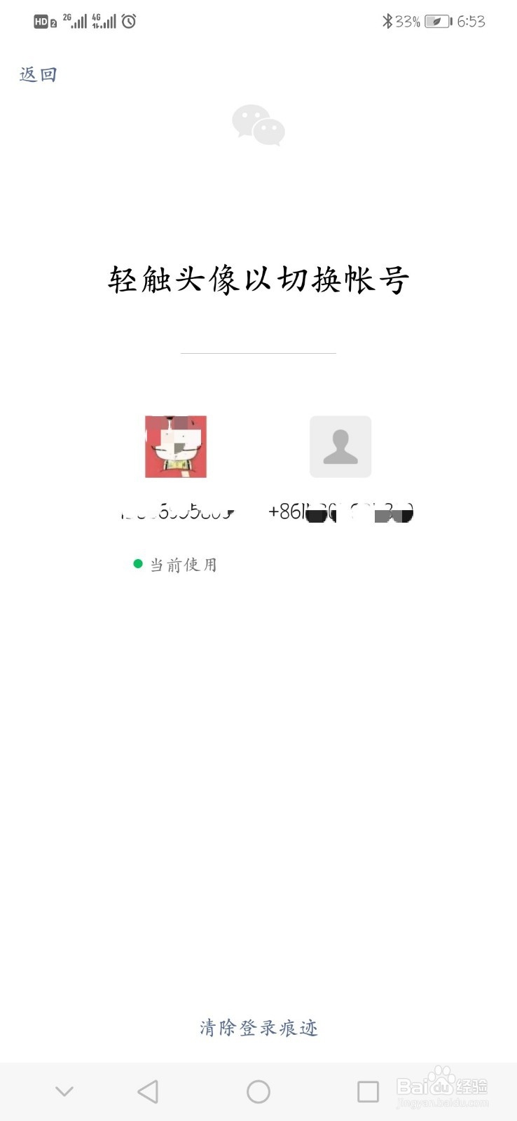4/4进入“切换账号”界面。可以看到手机上微信登录的历史账号记录。图片中显示该手机曾经登录过2个账号,其中前面一个为当前登录账号。