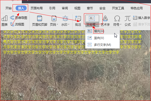 2、点击菜单栏的“插入”,接着点击“文本框”,然后在弹出的下拉列表中点击“横向”。