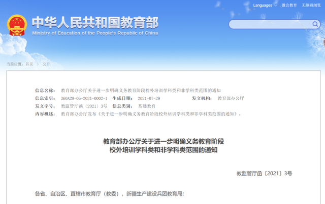 教育部办公厅29日发布《关于进一步明确义务教育阶段校外培训学科类和非学科类范围的通知》,指出:根据国家义务教育阶段课程设置的规定,在开展校外培训时,道德与法治、语文、历史、地理、数学、外语(英语、日语、俄语)、物理、化学、生物按照学科类进行管理。