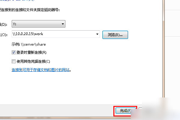 5、返回“Map Network Drive”设置向导界面,单击右下角的“Finish”按钮,完成添加网络共享磁盘。