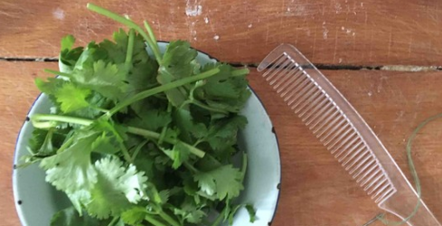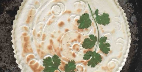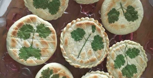3、面团分成剂子,包入适量馅料,用手头的工具在表面印出花纹,放上香菜装饰。