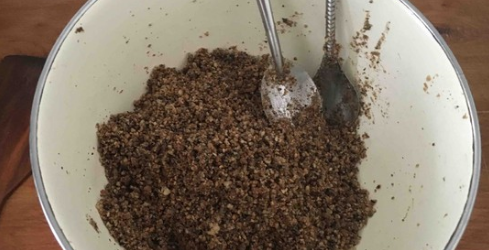 2、将适量芝麻、适量核桃、适量花生等果仁炒熟,加入适量盐和适量五香粉拌匀碾碎,做成馅料。