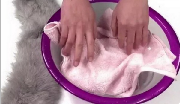 2、干净的毛巾在加入漂白剂的盆子中浸湿后拧干水分(九分干,不能滴水)。