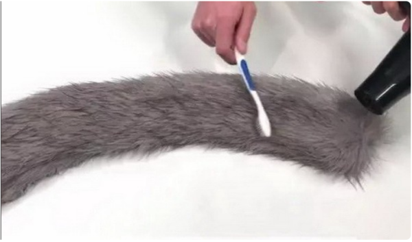 4、擦拭完成后,左手拿吹风机,右手拿牙刷,顺着狐狸毛的方向一边刷一边吹。