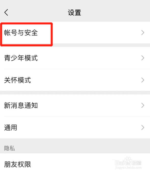 第一步,进入苹果微信设置页,点开帐号与安全设置界面。