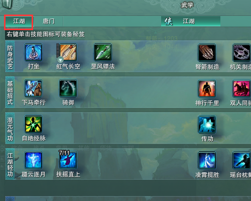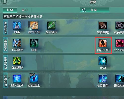 四、点击江湖后,等待加载完成,会出现四个技能分类,防身武艺,基础招式,混元气功,江湖轻功,找到基础招式功能栏中的神行千里并右键点击它。